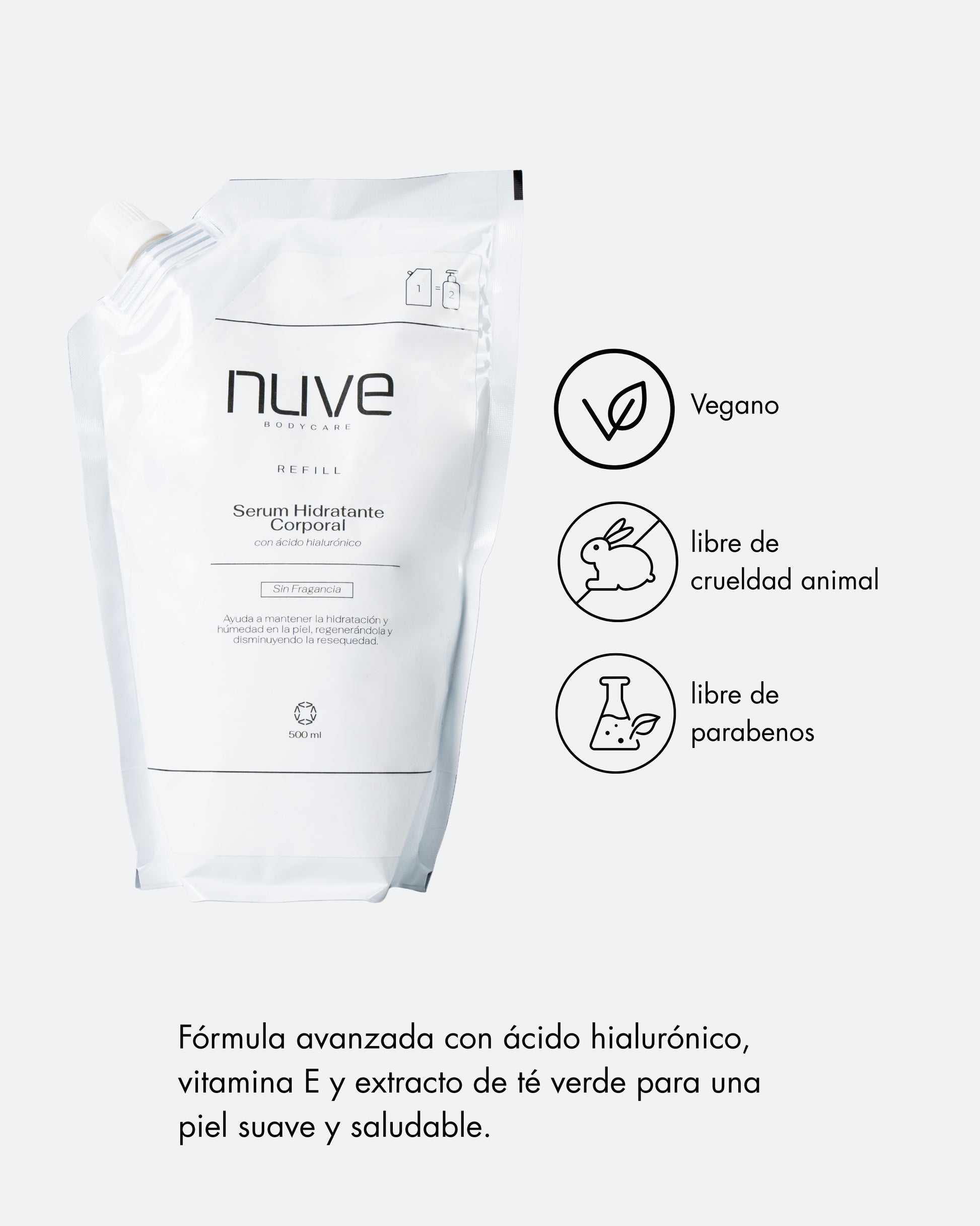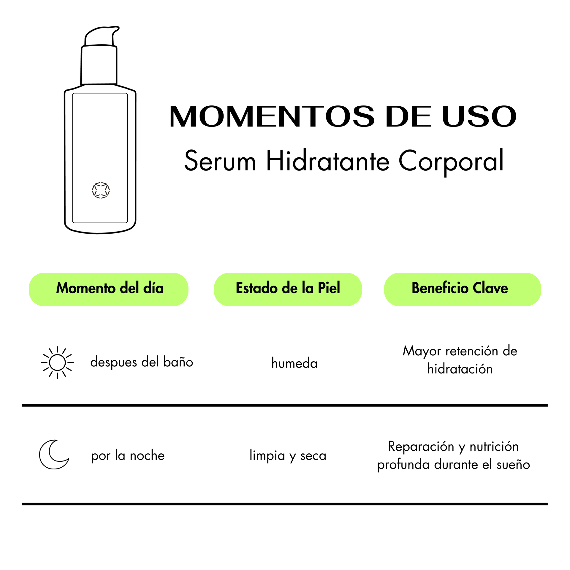 Aplica una pequeña cantidad sobre el cuerpo húmedo, distribuye con movimientos circulares y permite que el sérum se funda con tu piel. No es necesario secar ni enjuagar.